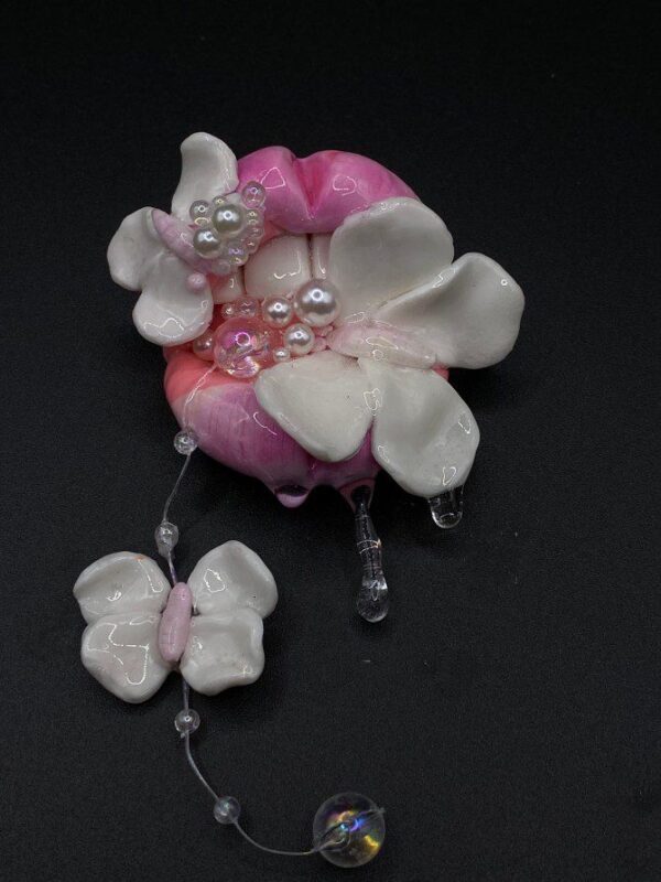 This piece of work is an original design and is purely handmade. It comes with a chain and can be worn either as a necklace or as a brooch.